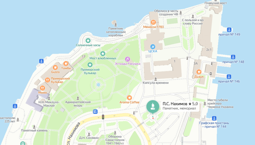 В этой статье посмотрим на памятник П.С. Нахимову, рассмотрим детали, узнаем его историю. Ну что, пойдём посмотрим памятник? Совсем недавно проходила рядом с памятником и поняла, что он уже много раз был в статьях, а вот подробно, в деталях я никогда его ещё не показывала. Надо исправлять ситуацию. Памятник установлен в центре Севастополя, на площади Нахимова. Рядом находятся Графская пристань и Вечный огонь. На карте отмечена остановка общественного транспорта «Площадь Нахимова», Здесь останавливаются все маршруты, которые проходят через центральное городское кольцо. Напомню как выглядит памятник: Давайте посмотрим внимательнее на все детали памятника. На памятнике есть 3 горельефа. Горельеф — разновидность скульптурного выпуклого рельефа, в котором изображение выступает над плоскостью фона более чем на половину объёма изображаемых частей. Некоторые элементы могут быть совсем отделены от плоскости. На горельефах изображены эпизоды из биографии Нахимова: «Синопское сражение», «