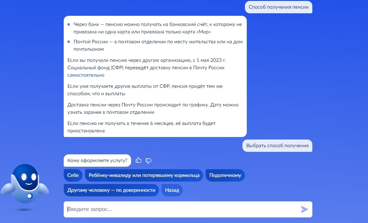 Напечатайте в чате «Способ получения пенсии» и затем выбирайте, кому нужно оформить услугу, себе или другому человеку