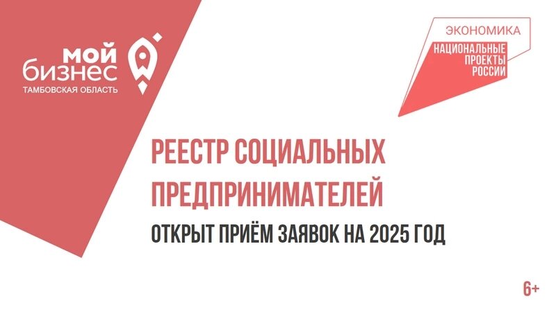 Региональный центр «Мой бизнес» открыл приём заявок на включение субъектов МСП в реестр социальных предпринимателей в 2025 году В Тамбовской области стартовал приём заявок на включение в реестр социальных предпринимателей. Претендовать на звание "социального" может бизнес, приоритетным направлением которого является поддержка проектов, ориентированных на улучшение качества жизни уязвимых групп населения и лиц с ограниченными возможностями здоровья. Для предприятий, получивших социальный статус, доступен ряд преимуществ: - Сниженные налоговые ставки: 1% на доходы и 5% на уменьшенные расходы - Возможность получить кредит под 1/2 от ключевой ставки ЦБ - Приоритетное участие в проектах по развитию социального предпринимательства - Специальная табличка «Социальное предприятие» для оформления офиса. Также в качестве мер поддержки на территории региона для социальных предпринимателей действуют льготное кредитование, уникальные обучающие программы, система наставничества, консуль