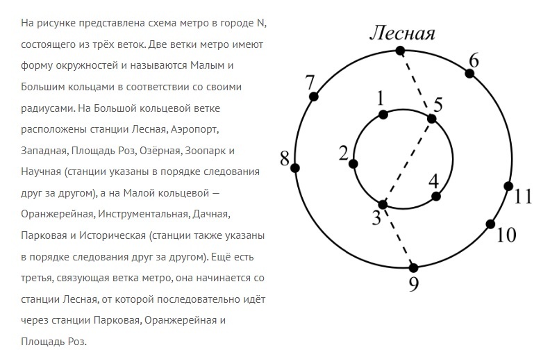 Задание №1-№5 Начинаем читать: находим Большое и Малое кольцо Далее подписываем станции на Большом кольце, но, не понятно в какую сторону двигаться. Замечаем в конце текст про третью ветвь, которая начинается от ст. Лесная и заканчивается площадью Роз. Таким образом от ст. Лесная на Большом кольце нужно двигаться против часовой стрелки Аналогично, подписываем станции Малого кольца (движение здесь уже по часовой стрелке) Все станции подписаны. Можем выполнить задание №1 А именно Ответ: 84117 Выполните самостоятельно: Ответ к этому заданию, а также решение №2-№4 этого блока в следующей публикации А вот задание №5 можно решить и без схемы! Узнаем сколько карточек каждого вида понадобится для 45 поездок (чёрным на рисунке) и во сколько обойдётся их покупка без учёта скидки Последний вариант сразу отбрасываем, так как он "дороже" по крайней мере предыдущего Считаем стоимость каждого варианта с учётом скидки. Как быстро найти 10% от числа? 10% это 1/10 числа, то есть 10% от 1850 это 185 рубл