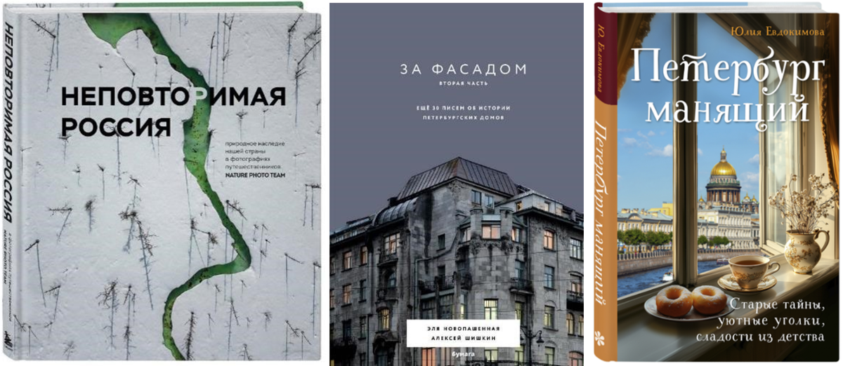 В альбоме представлены красоты центральной России, Ямала, Таганая, Курильских островов, Хибин и других мест. Эля Новопашенная, Алексей Шишкин «За фасадом. Вторая часть. Ещё 30 писем об истории петербургских домов». Во второй части книги «За фасадом» вы прочитаете продолжение исследований историй петербургских домов и их обитателей. Представлены 30 новых писем с удивительными рассказами, которые формируют образ Санкт-Петербурга. Авторы отмечают, что изучая старинные здания, мы создаем эмоциональную связь с их историей, поэтому акцент в книге сделан на истории не только домо