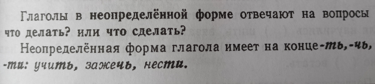 1. Актуализация знаний. Проспрягаем глаголы встаю, спешу, побелею, подарю, улетел, морозил. - К какому времени относятся глаголы встаю, спешу? (К настоящему). - К какому времени относятся глаголы побелею, подарю? ( К будущему). - К какому времени относятся глаголы улетел, морозил? (К прошедшему). - Как изменялись глаголы настоящего и будущего времени? (По лицам и числам). - Как изменялись глаголы прошедшего времени? (По числам и родам). 2. Объявление темы урока. Есть ещё одна форма глагола. В ней нельзя определить ни время, ни число, ни лицо, ни род. Потому она так и называется неопределённой формой глагола. Это тема нашего урока. 3. Работа по теме урока. Прочитайте предложения на стр. 89. Найдите глаголы, которые оканчиваются на -ть, - чь, - ти. Определите время, число, лицо, род глаголов учить, выучить, зажечь, идти. (Невозможно). Поэтому эти глаголы стоят в неопределённой форме. Прочитайте правило на стр. 89. - На какие вопросы отвечают глаголы в неопределённой форме? - Какие буквос