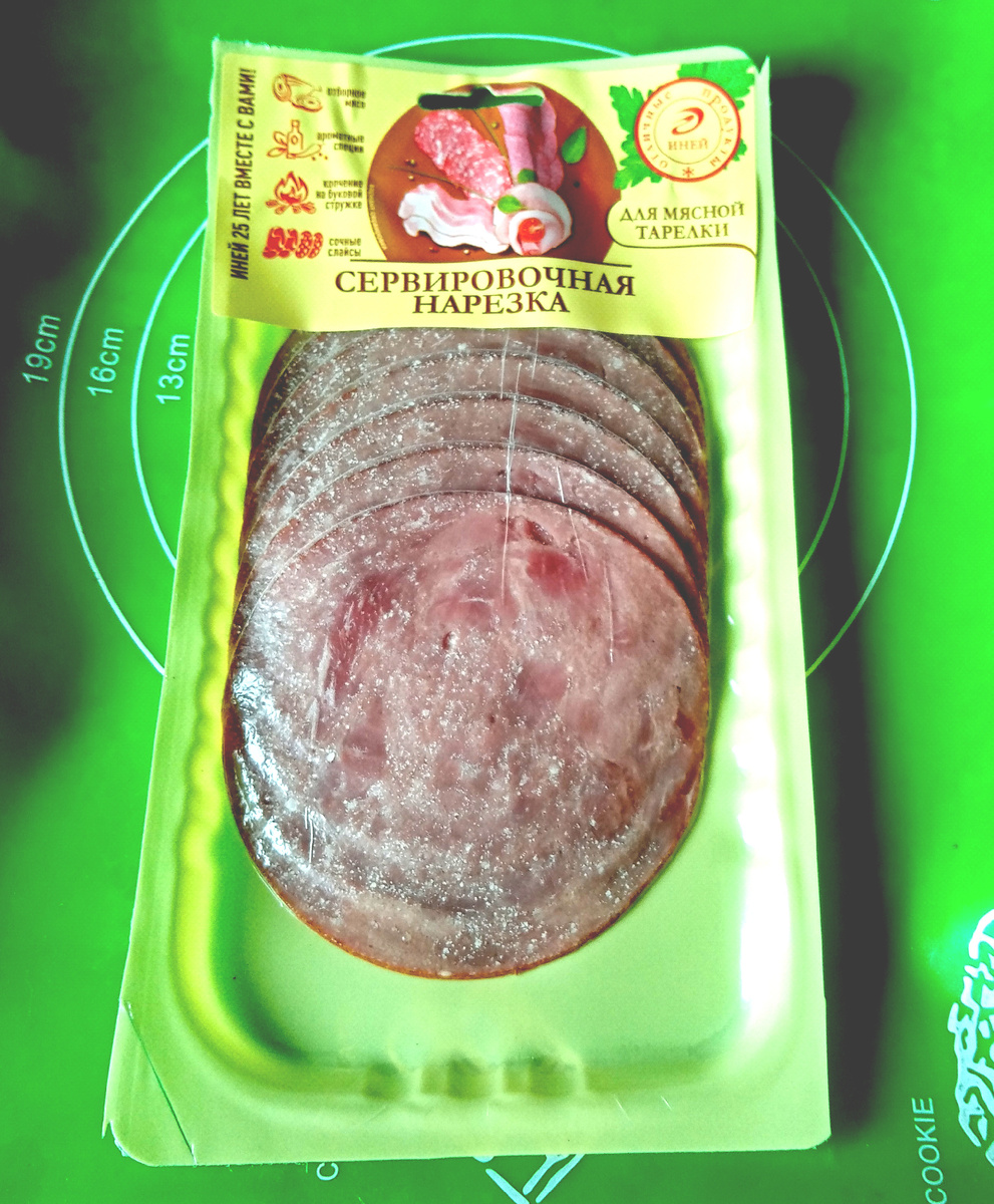 Купила в "Магните" нарезку. На подложке. Через пленку видно свежий продукт. Фото не очень удачное, да еще сфотографировано через пленку. Покажу с обратной стороны: Вес 80 грамм. Цена 140 рублей. Надо распаковать. и попробовать. Очень вкусная нарезка. Распаковка ниже: Мой канал на Ютубе https://www.youtube.com/channel/UCxR-cVRpbp0ZCwUI4Sro3aA ВСЕ ФОТО АВТОРА ЕЩЕ СТАТЬИ НА КАНАЛЕ Мисс Обзоровна: