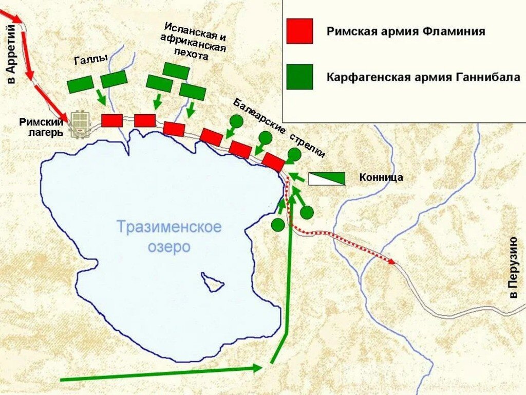 Фламиний двигался по дороге, не подозревая о засаде. Римляне пренебрегали разведкой, но знали основы стратегии. Узнав о вторжении Ганнибала, они должны были соединиться с армией другого консула, которая шла по той же дороге. Гай Фламиний мечтал окружить Ганнибала и разбить его.