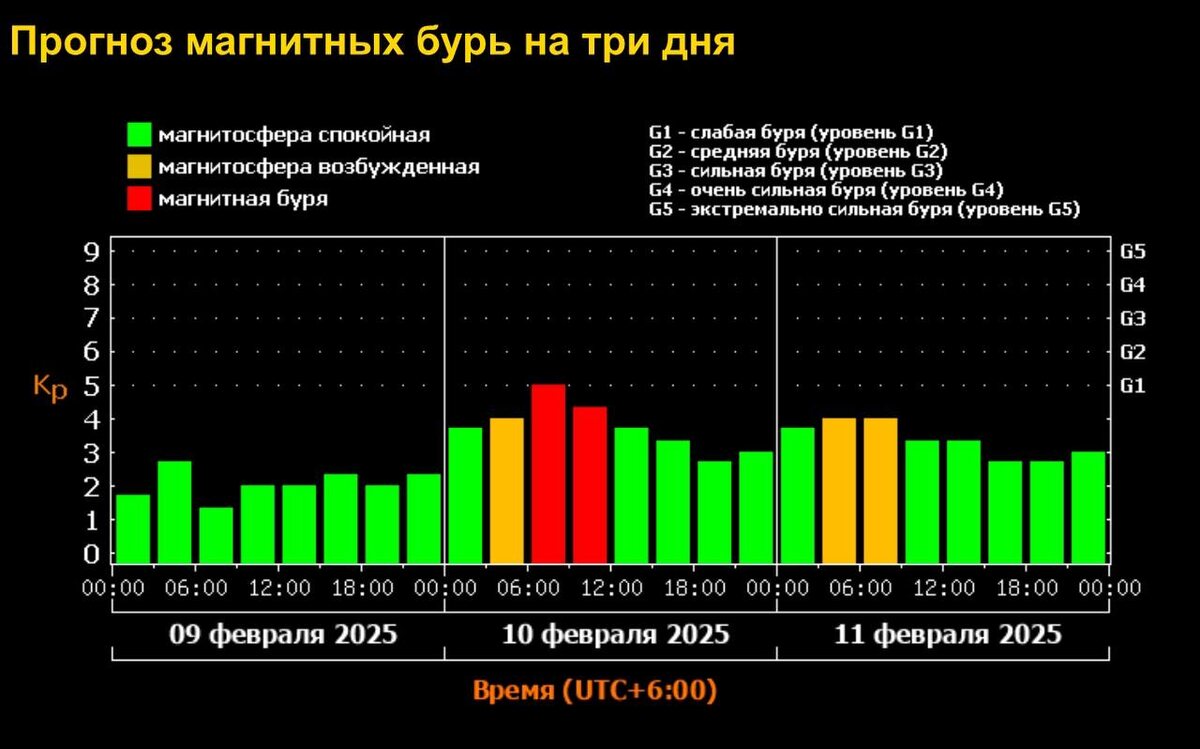 Специалисты Лаборатории солнечной астрономии ИКИ и ИСЗФ представили прогноз магнитных бурь на ближайшие дни. Геомагнитные возмущения начнутся уже 10 февраля. Буря затронет Омск с 06:00 до 12:00 и будет считаться слабой, с уровнем G1. Напоминаем, что магнитные бури могут оказывать влияние на самочувствие метеозависимых людей. В период их активности рекомендуется избегать чрезмерных физических нагрузок, пить больше жидкости и уделять внимание качественному сну. Фото: сайт лаборатории солнечной астрономии ИКИ и ИСЗФ.