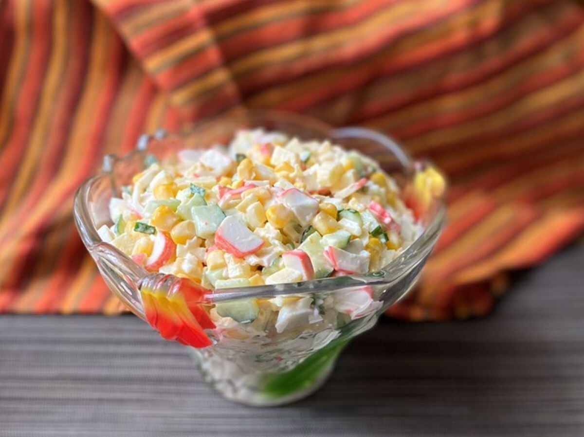 Во всем мире, кроме Японии, сурими продается как замена «настоящего краба», но состав от наших палочек отличается, процент содержания белка у них в крабовых палочках выше, хотя ранее был на уровне междунарожных стандартов. Тем не менее, раз в год или два, дочь непременно покупает пачку теперь уже "снежного краба", и просит приготовить когда-то любимый ею салат с мандаринами или вот этот, которым поделюсь сегодня. Вдруг кто-то из вас тоже ностальгирует и периодически готовит себе такое. Название сама придумала, не знаю как он назывался в то время. Продукты самые простые, готовится просто.