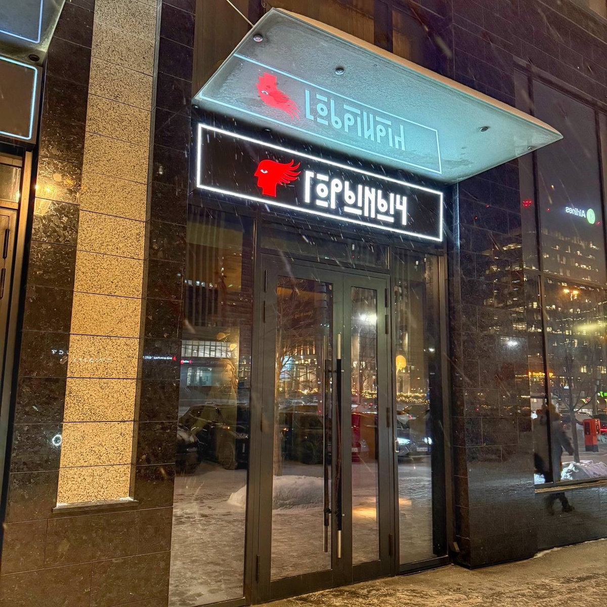 Ресторан «Горыныч» открылся на первом этаже ЖК Richmond. Открылся по франшизе. Приглушённый свет, два этажа. Музыка буквально «долбит». Видимо, чтобы люди не засиживались. Вечером людно, но немало и пустых столов — они якобы забронированы, хотя табличек с резервом не заметил. В первую очередь заполняют неудобные места за баром и за общим столом на втором этаже. Возможно, чтобы захотелось прийти ещё раз и посидеть за нормальным столом. С потолка свисают деревянные резные элементы, напоминающие веретено. На стенах репродукции картин художника Билибина. Интерьер внушительный. Приветственную воду не наливают, но приносят комплемент в виде взбитого масла с четверговой солью. К маслу — корзинка с хлебом. Несколько видов из того, что пекут сами. Борщ с пастрами из говядины и и копчёной грушей по 640 ₽. Подаётся со сметаной, зелёным луком, корочкой бородинского хлеба и крупной солью. При заказе предупреждают: борщ на вкус слегка сладковат, от груши. Это я знал и сам, потому чт