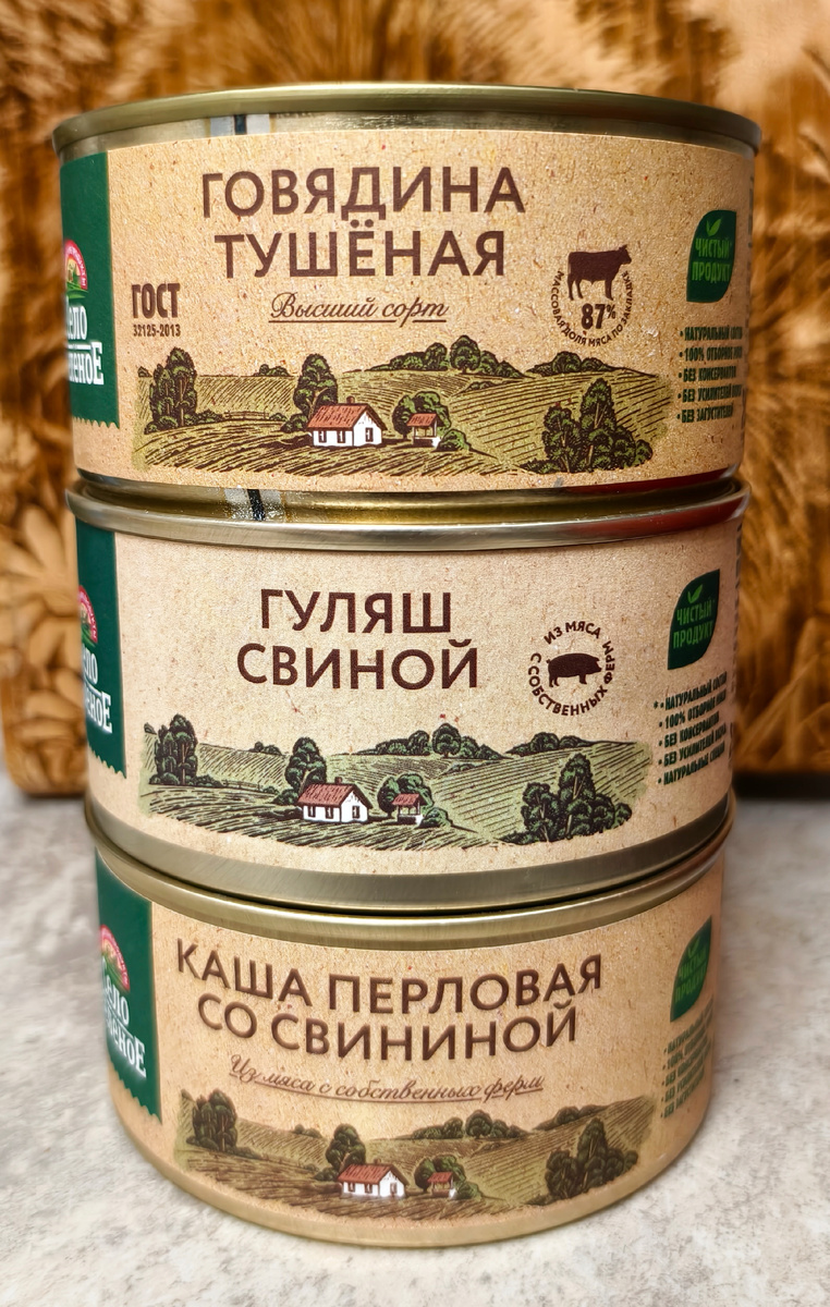 Всем привет! Мне так понравились консервы с прошлого обзора, что я решил купить ещё некоторые позиции на пробу. Наткнулся на них случайно в магазинчике у дома, где я покупал ячневую кашу. Сегодня буду пробовать тушёную говядину, свиной гуляш и перловую кашу со свининой. Цены возможно будут завышены. Начну с говяжьей тушёнки. Цена 225 рублей. Изготовитель: ООО "Сарапульский мясокомибинат", Удмуртская республика, г. Сарапул. В составе говядина, жир-сырец говяжий, лук репчатый, соль, лавровый лист, перец черный. Изготовлена по ГОСТу. Тушёнка высшего сорта, содержание мяса не менее 58%. Срок годности 4 года в алюминиевой банке 3 года в жестяной. У меня банка похожа на жестяную. Масса 325 граммов. Срок годности в норме. Внутри видно много жира и жидкости. На дне была ещё куча желе. А вот мяса то тут почти нету. Есть какая-то масса. Что-то типа фарша вперемешку с жиром. Полно вот таких кусков шкуры или жира. В общем я недоволен). По вкусу масса не пересолена и не сухая. Ещё бы ей