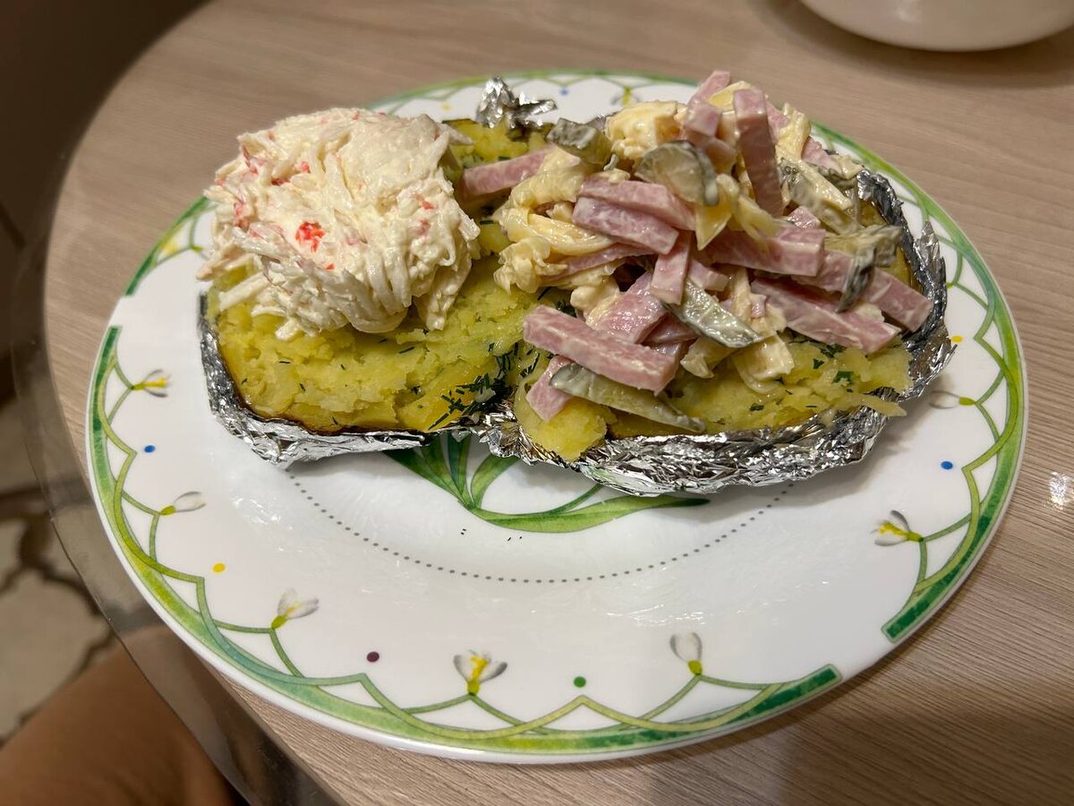 Выкладываем начинки на картошку. Я рекомендую использовать и крабовую, и ветчинную начинки — это добавит разнообразия и вкуса. Подаем с рубленным укропом для свежести.