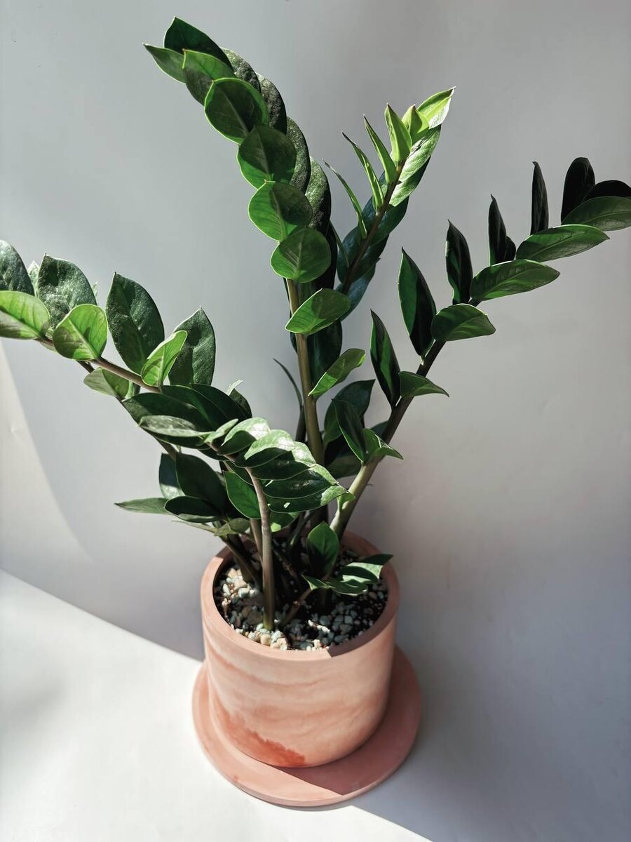 Замиокулькас, или «долларовое дерево», — это популярное комнатное растение, которое завоевало любовь цветоводов благодаря своей неприхотливости и эффектному внешнему виду. Родом из тропических регионов Африки, замиокулькас отлично адаптировался к условиям современных квартир и офисов. Рассмотрим его основные особенности. 1. Внешний вид Замиокулькас обладает мясистыми, глянцевыми листьями темно-зеленого цвета, которые растут на толстых стеблях. Листья имеют сложную структуру и состоят из множества мелких листочков, что придает растению изысканный и экзотический вид. Взрослое растение может достигать высоты до 1 метра, что делает его отличным украшением интерьера. 2. Неприхотливость Одной из главных особенностей замиокулькаса является его способность выживать в самых сложных условиях. Он легко переносит недостаток света, редкий полив и сухой воздух, что делает его идеальным выбором для тех, кто часто бывает в разъездах или забывает ухаживать за растениями. 3.Полив Замиокулькас относитс
