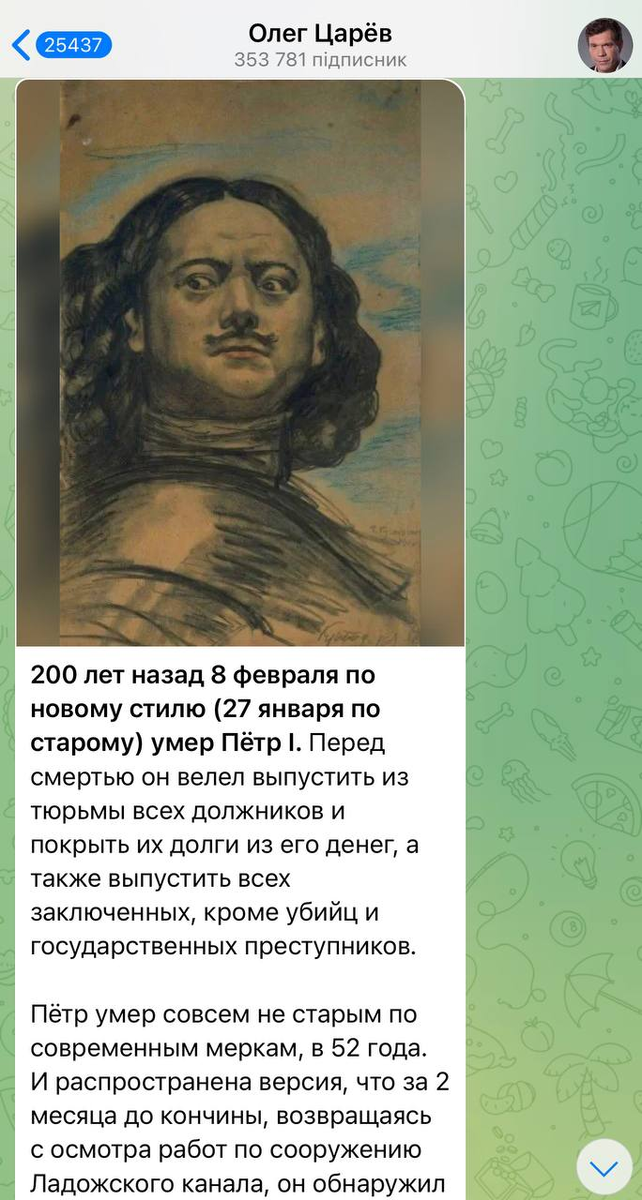 Знаете, я как зайду на страницу к Олегу Цареву, потом прихожу в себя несколько часов. Умеет он удивить все-таки! Оказывается, Петр Первый умер в 1825 году. В одно время с Александром Первым, как я понимаю. Даже раньше - Александр Первый вроде умер в декабре, то есть в конце года, а Петр Первый - в начале. Надо же... А я думала, его восстание декабристов доканало. Вечно на декабристов вешают всех собак, даже бездомных. Оказываются, они тут ни при чем. Ну и хорошо. Нет, я понимаю ,можно ошибиться, нажать не на ту цифру, опубликовать странную картинку - я и сама вечно огребаю от подписчиков за опечатки...Но я все-таки лицо неофициальное, генералам советовать не лезу и президента работать не учу. С меня какой спрос? А употреблять фразу "Как мне стало известно от моих источников" я научилась у Юры Подоляки, просто он свои сны так называет, а я - новости из какого-нибудь федерального средства массовой информации, вот и вся разница. А Царев, на минуточку, по студиям как эксперт бродит и речи