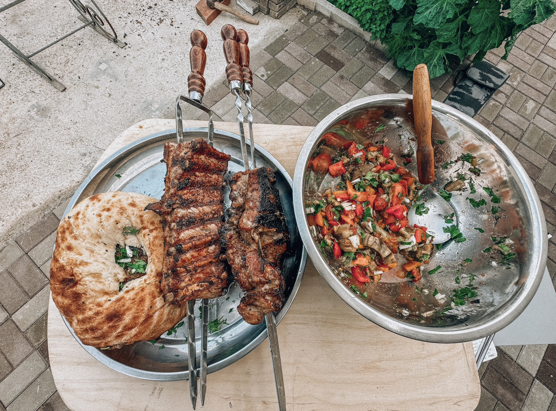 Маринад: соль, перец Чили сухой, паприка, базилик, масло растительное, вино белое сухое, лук репчатый 2 шт. Салат: Готовим маринад. В противень насыпаем по три щепотки соли, перец чили сухой, молотую паприку, сушеный базилик или орегано, масло растительное 100 мл, лук репчатый 2 шт., пропускаем на средней терке. Берем ребра и натираем их готовым маринадом. Накрываем пищевой пленкой и оставляем мариноваться на 2 часа. Нанизываем баклажаны, перцы и помидоры на шампура и готовим на углях. Баклажаны 7-10 минут, перцы и помидоры 5 минут, после в тарелку и накрываем пленкой на 10 минут, для лучшего снятия кожуры. Далее почищенные овощи нарезаем кубиками и добавляем соль, перец черный, чеснок сушеный по вкусу, оливковое масло. Добавляем петрушку , укроп, репчатый 🧅 нарезанный полукольцами. Салат готов! Свиные ребра нанизываем на шампура и готовим на углях 20-25 минут. Приятного аппетита! Видео рецепт приготовления :