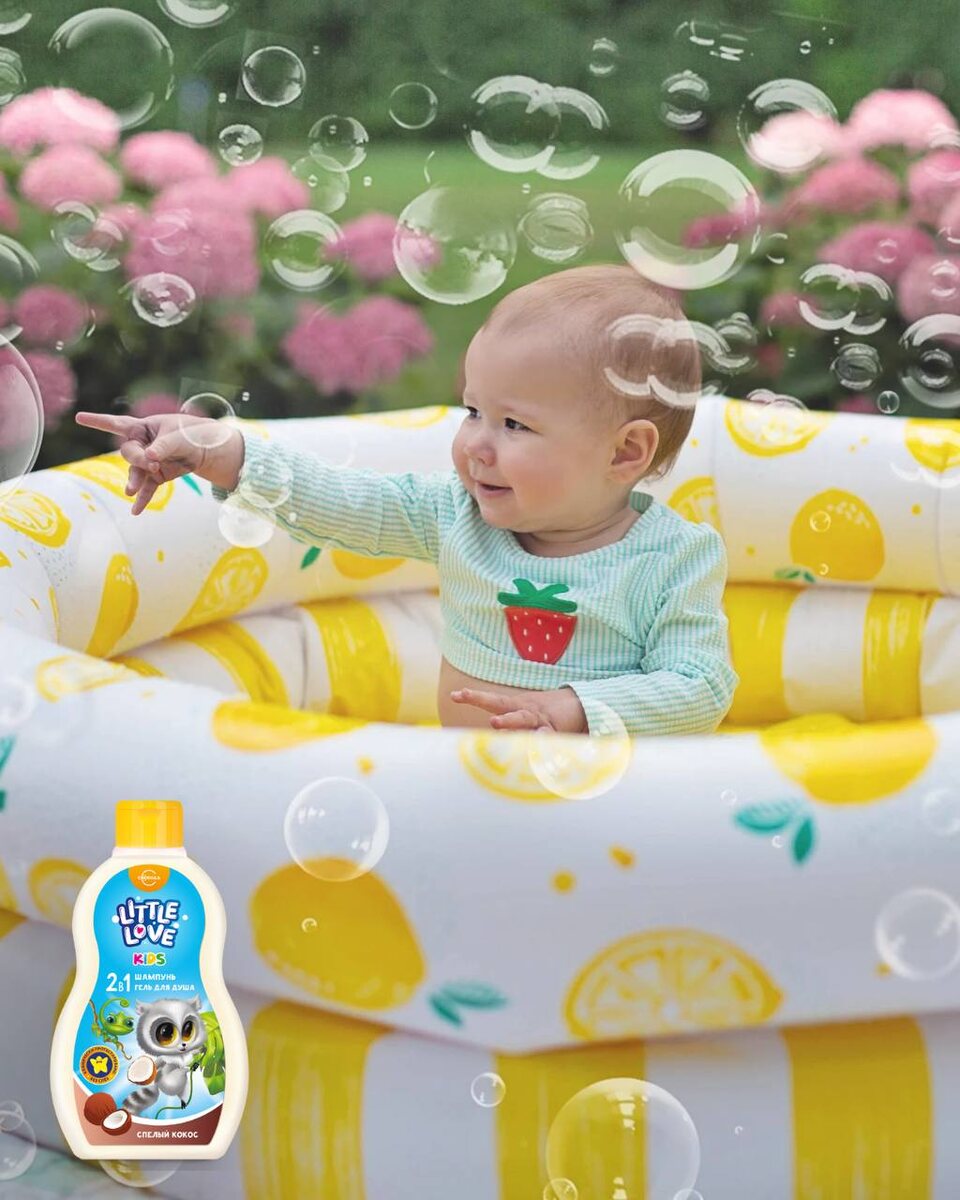 Купание малыша — это не только важная гигиеническая процедура, но и отличный момент для общения и игры. Сделайте этот процесс еще более увлекательным с помощью мыльных пузырей! Они не только развлекают малыша, но и помогают создать атмосферу веселья и радости в ванной. Один из способов превратить купание в настоящее приключение — использовать шампунь-гель для душа 2 в 1 "Little Love" с ароматом спелого кокоса. Это средство сделает купание приятным не только для малыша, но и для вас. Тропический аромат кокоса: нежный кокосовый аромат создаст атмосферу тропиков и поможет малышу расслабиться во время купания. Он будет чувствовать себя как на отдыхе, что сделает процесс купания еще более захватывающим. Мыльные пузыри — весело и безопасно: превратите каждое купание в игру с помощью мыльных пузырей. Пены и пузыри можно запускать и ловить, создавая увлекательные моменты для малыша. Это не только веселит, но и помогает развивать мелкую моторику, улучшая координацию движений. Двойное действие