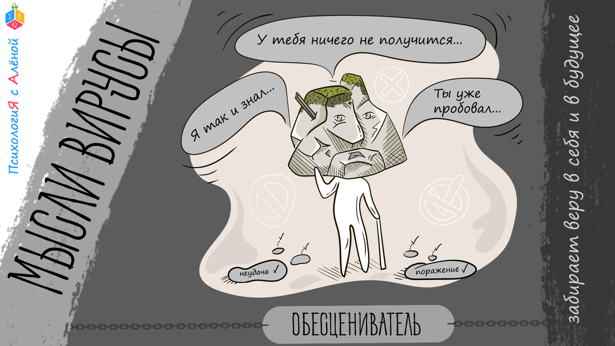 Мысли-вирусы - это программы которые мы неосознанно прокручиваем у себя в голове, а потом воспроизводим то о чем думаем в нашу жизнь. Эти мысли возникают как некий грустный, озабоченный, унылый голос внутри. Он умудренный жизнью и потухшим взглядом останавливают любое твое движение. В его копилке воспоминаний только неудачи, поражения, потери. Они как камни лежат на дороге выстилая ориентир и ограждая тебя от возможных ошибок. Это вирус поколений, он вынес достаточно, много испытал - в него забивали гвозди чужих убеждений, ставили "палки в колеса" ( одна палка прямо таки вросла в него). Его также когда-то пытались останавливать от роста, движения, запреты забирали радость и оставляя безжизненный опыт. А если высосать радость как дементоры в Гарри Потере, то любому опыту ничего не остаётся как стать "камнем преткновения" на твоём жизненном пути. В "обесценивателе" остановилась жизнь - нет будущего, но есть существующая явь в виде отяжелевшего камня - он же «факт». И этому опыту ведётся
