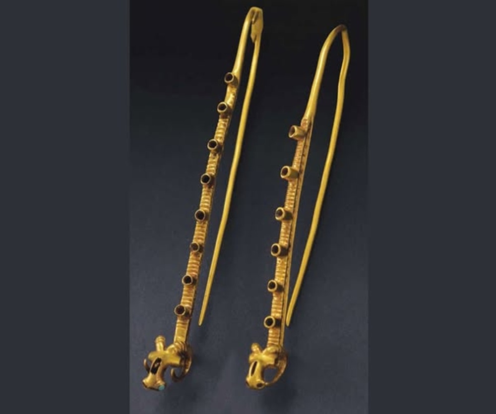 Две золотые булавки в форме головы Аргали (Аргаль или горный баран — парнокопытное млекопитающее из семейства полорогих, обитающее в горных районах Монголии) были найдены в квадратной гробнице на горе Тэвш в сомоне Богд аймака Өвөрхангай. Эти золотые булавки, уникальный дизайн которых пронизан изобретательностью древних монголов, были обнаружены в 1971 году археологами Д. Навааном и Ц. Доржсурэном из Историко-культурной исследовательской экспедиции Монгольской Народной Республики. При раскопках квадратной каменной гробницы размером 10х6 м золотые булавки были размещены крест-накрест на висках мужчины, погребенного на глубине 1,8 м. Головка туловища булавок прекрасно передает форму головы Аргали с его огромными загнутыми внутрь рогами, острой мордой и большими пронзительными глазами. Шея и грива Аргали украшены крестообразным узором, напоминающим зубья пилы, а между ними расположены 6 или 8 зелено-бирюзовых инкрустаций, создающих красивое декоративное цветовое сочетание. Артефакт считае