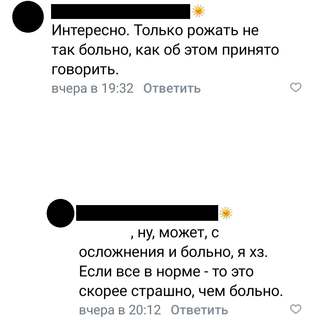 Итак, факт первый. Роды - абсолютно безболезненный процесс. Есть страх, да, но боли никакой нет. А если у вас есть хоть какая-то боль, то вы сами виноваты. Это у вас просто патология или осложнения. Вот мнение мамы двоих детей: