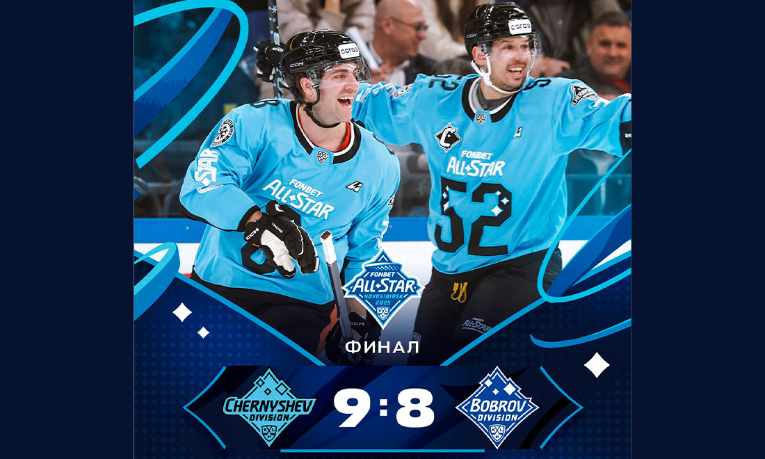 В Новосибирске на «Сибирь-Арене» состоялся финал Матча звёзд Континентальной хоккейной лиги 2025 года. В напряжённой борьбе Дивизион Чернышёва одержал победу над Дивизионом Боброва – 9:8. В составе победителей голы забили Даниил Гутик, Тревор Мёрфи, который отметился хет-триком, Максим Филимонов, Александр Хмелевски, Наиль Якупов, Алекс Гальченюк и Сергей Широков. Лучшим игроком финала признан любимец новосибирских болельщиков Тревор Мёрфи. Его вклад в победу команды был неоценим.