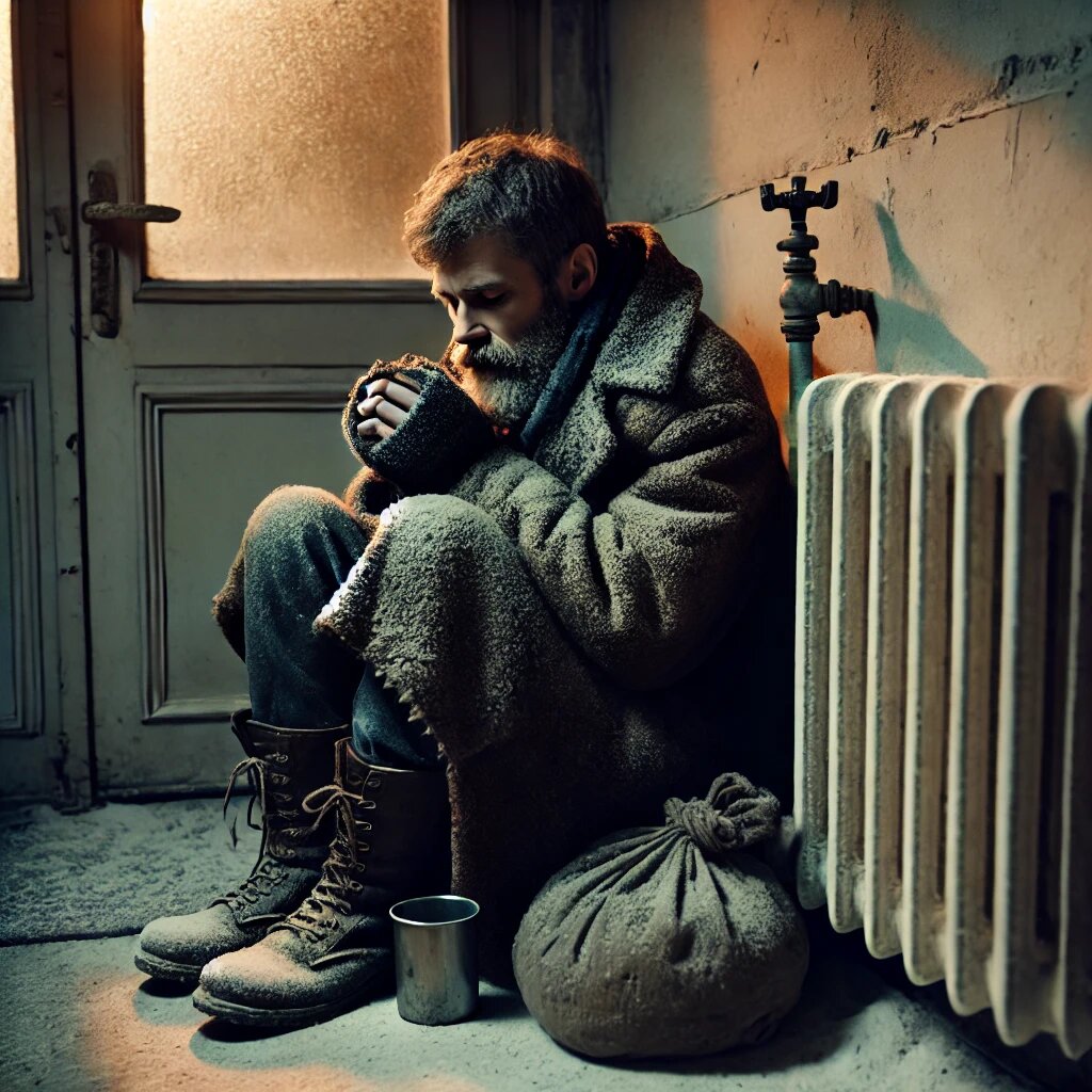Мужик сел на пол, прямо у двери, сжавшись так, чтобы не привлекать внимание. Каждый раз, когда кто-то заходил или выходил, он извинялся и повторял: «Я просто пережду мороз».