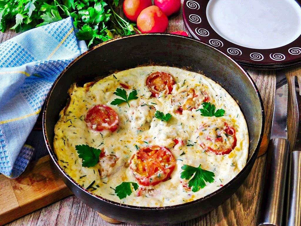 - Подавайте: Готовую яичницу переложите на тарелку, украсьте свежей зеленью. Подавайте с тостами или свежим хлебом.
