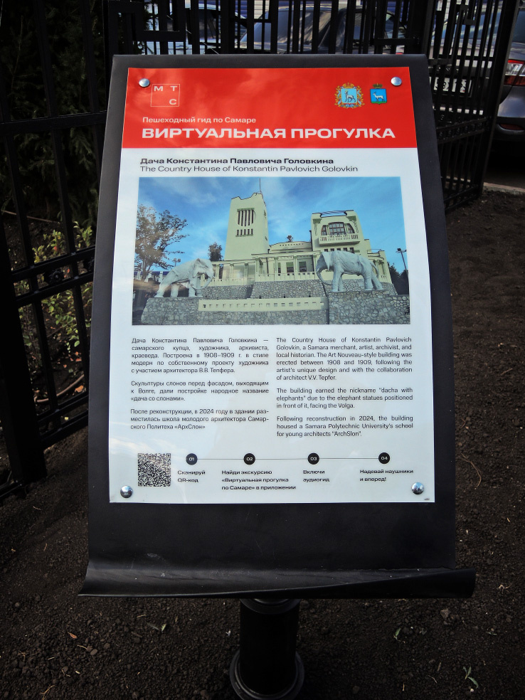 Неделю назад я рассказал об одном из самых интересных зданий Самары - даче купца Головкина, известной как «дом со слонами» или «дача со слонами». Это уникальный образец архитектуры рубежа XIX-XX веков. О его истории можно почитать по ссылке в конце статьи. В сентябре 2024 года здание было открыто после масштабных реконструкционных работ. Предлагаю начать осмотр получившегося варианта. В первой части новой серии покажу периметр вокруг самого здания. Фотографии сделаны в сентябре и октябре, разница примерно месяц, поэтому будут отличия. Комплекс дачи Головкина находится в самом конце улицы Советской Армии, около территории НФС. Прямо около входа установлена конечная точка автобусных маршрутов 35, 91 и 89. Остановочный павильон в ходе реставрации тоже полностью заменили, тематически привязав к достопримечательности. Самым ярким элементом дачного комплекса являются фигуры двух слонов, которые и стали его символом. Изображения этих животных теперь есть и на павильоне,.. ... и на воротах, ве