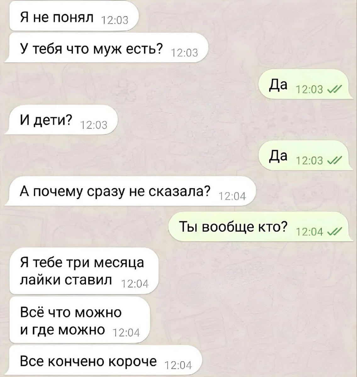 Надеешься на отношения, ставишь лайки... А она вот так с тобой поступает... Говорят, что наглость - второе счастье... Мы знаем, что девушки любят вкусно покушать. Но такая "наглость" не всегда прокатывает с мужчинами. Когда идёшь в ресторан главное не перепить, иначе, когда протрезвеешь, можно узнать, что твоя жизнь круто изменилась. Кстати о замужестве... Вот только если вы пытаетесь мужчину чем-то попрекнуть, выбирайте более весомые аргументы. Да и сами вы тоже частенько косячите. Берите любимых за руку не для чего-то, а просто так. Давайте своей второй половинке дельные советы, особенно если они стараются сделать что-то самостоятельно. И не стоит никогда зазнаваться. Сегодня у вас может быть всё, а завтра вы можете всё потерять. Берегите и цените то, что имеете. Всем спасибо! Если понравилось - ставь лайк и не забудь подписаться на канал. А почитать предыдущий выпуск ты можешь 👉 здесь или найти больше мемов в нашем телеграм канале.