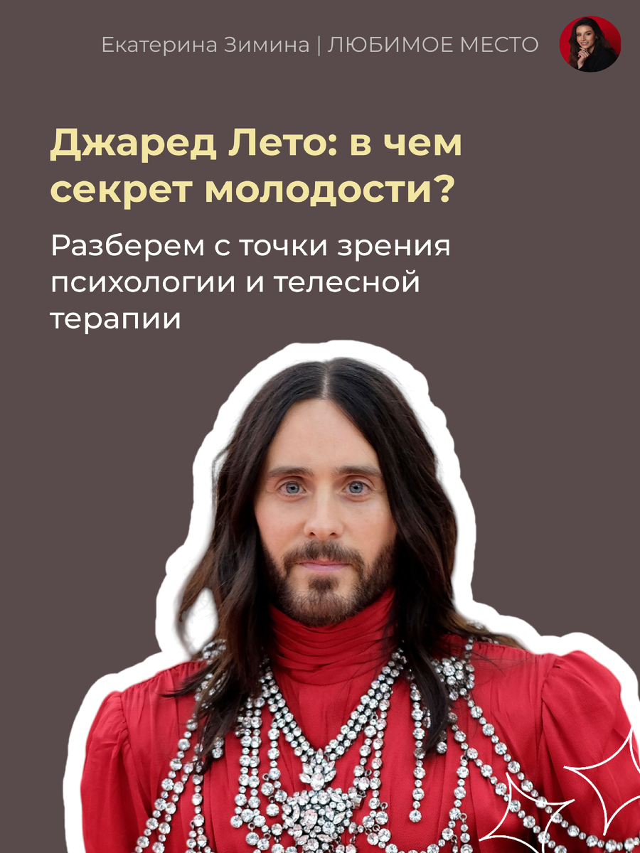 Разберём с точки зрения психологии и телесной терапии. Джаред Лето: в чём секрет его молодости? Этой осенью мои друзья были на концерте голливудского музыканта Джареда Лето. Я не смогла присоединиться к ним, поэтому мне достались только видео с любимыми песнями. А в чате с друзьями мы обсуждали не его выступление, а его "молодость". Джареду уже 52 года, но за последние лет 20 его внешность практически не изменилась. И вот в чём его секрет — в жизни Джареда нет места сигаретам и алкоголю. Уже много лет исполнитель придерживается принципа: «полная жизнь — это жизнь без зависимостей в сочетании с безграничной заботой о себе» Хорошую физическую форму артист поддерживает с помощью активной ходьбы, езды на велосипеде, интенсивных силовых и кардиотренировок пять раз в неделю. Я всегда говорю клиентам, что счастье – это отсутствие стресса, нужно помнить о своём ментальном здоровье. Например, Джаред Лето занимается йогой и медитирует. Как #ящитаю Джаред Лето выглядит так сильно молодо, пот