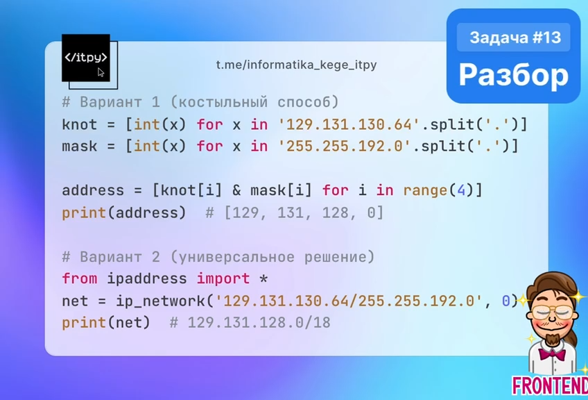 Маска: 255.255.192.0 Простейшая задача 13 номера с которой стоит начать изучение этих задач. Главная формула: Адрес сети = Адрес узла & Маска сети где & - это операция побитовой конъюнкции. Больше разборов на эту и другие задачи вы можете найти в нашем Телеграм канале: Информатика ЕГЭ | itpy 👨💻 Подписывайтесь на наш канал по теории Python: Азим вкатывается в IT | itpy 💻 Вы найдете тут много полезного!
