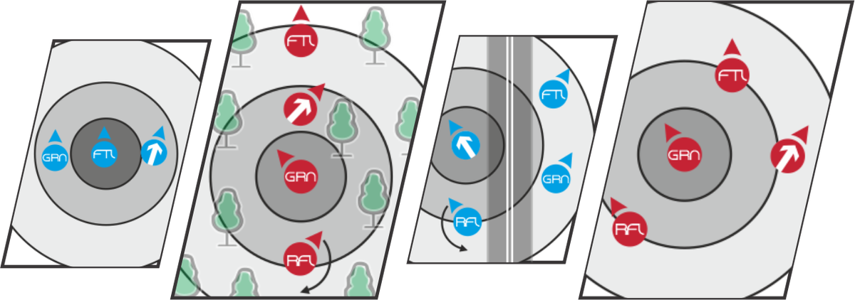 преимущества и ограничения каждой из них мы рассмотрим далее Используются в масштабе fireteam (команды/звена) Основное построение FireTeam, универсальное построение с максимальным обзором, которое позволяет команде быстро выстроиться в линию в любом направл