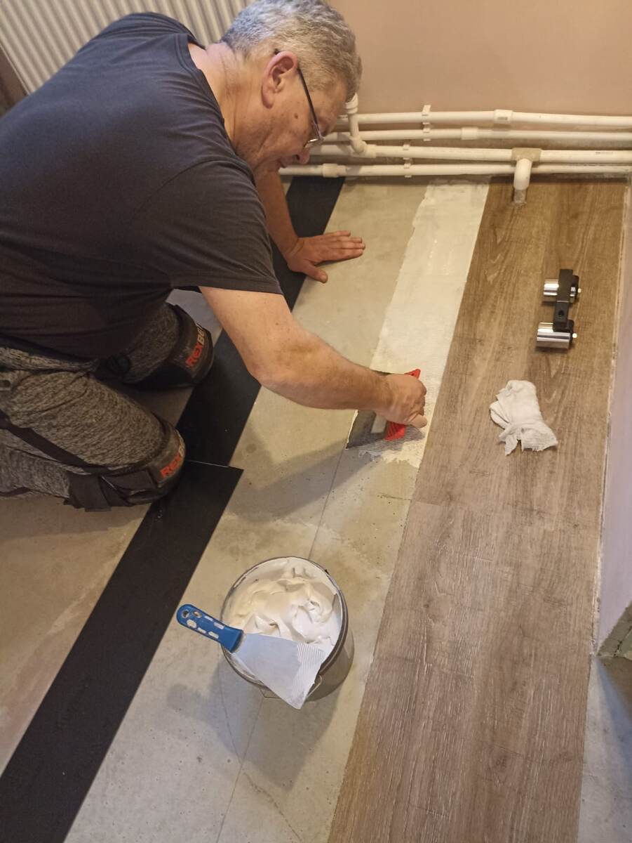 Почему из множества покрытий мы выбрали именно это. Да всё просто. Кто местный тот поймёт. Яблоновский топит раз в десять лет. Последнее наводнение было пять лет назад. Кварц винил не боится влажности, прочнее линолеума и выдерживает большие нагрузки. Виталик обещал, что через три дня пол будет готов. И приступит он к сборки кухонного гарнитура.