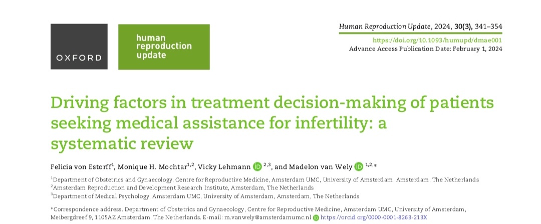 Источник: von Estorff F, Mochtar MH, Lehmann V, van Wely M. Driving factors in treatment decision-making of patients seeking medical assistance for infertility: a systematic review. Hum Reprod Update. 2024 May 2;30(3):341-354. doi: 10.1093/humupd/dmae001. PMID: 38305635; PMCID: PMC11063545.