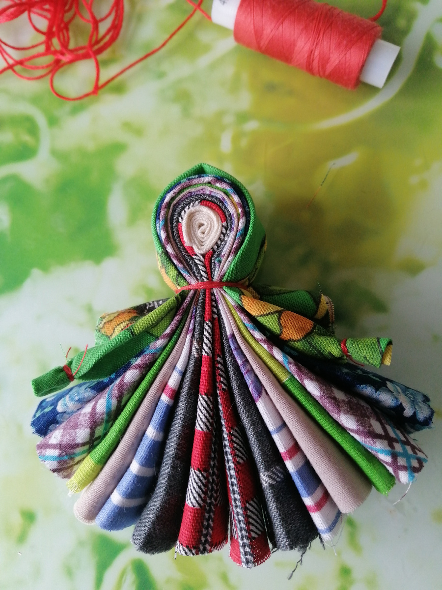 Северная Берегиня — это кукла оберег, помогающая хранить семейный покой. Изготовленная в виде веничка, она выметает из дома все плохое, оставляя в нем лишь счастье и радость. Такой талисман делали для всего семейства. Для изготовления куклы брали лоскутки ткани из одежды всех членов семьи. Для чего использовали куколку: • укрепление духовной связи между членами семьи; • защита семьи от внешних угроз — сглаза, порчи, завистников, разлучниц; • для устранения конфликтов и недопонимания; • для очистки энергетики и поддержания благоприятной атмосферы в доме. В центральную часть куклы размещали кусочек материи из одежды того, кто больше всего нуждался в защите. Это мог быть ребенок или взрослый. Таким образом мастерица укрепляла энергетику всей семьи и создавала круг защиты для самого слабого. Материал: • разноцветные кусочки ткани разных оттенков и расцветок для туловища куколки (7 штук, формата 8х20 см); • красный лоскут для платка (14х14 см); • полоска светлой ткани (4х12 с
