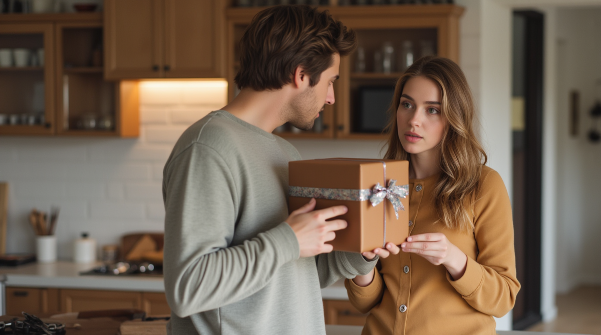 Он протянул коробку жене, но её лицо, только что светившееся любопытством, вдруг изменилось. Что-то промелькнуло в глазах — растерянность? обида? — и тут же спряталось за натянутой улыбкой.