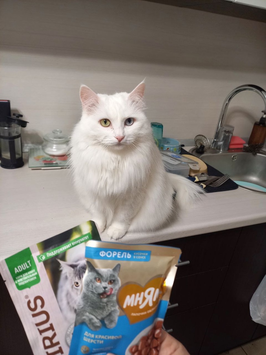 Влажный корм отличный вариант питания для кошки, т.к. удовлетворяет около 80% потребности воды. Если кошка кушает влажный корм, то она одновременно и накормлена, и напоена. В связи с этим, если вы решаете кормить кошку промышленным кормом, лучше всего приучать ее к влажному корму. В продаже влажный корм имеется в банках или в пакетиках (паучах). Если у вас один котик, то предпочтение лучше отдавать пакетикам, т.к. после открытия упаковки содержимое может потерять свою привлекательность для котика. Также влажный корм бывает двух видов: Давайте посмотрим, на что же мы должны обратить внимание при выборе влажного корма: В основном, котику среднего веса 4-5 кг необходимо 3-4 пакетика влажного корма в сутки. Но только если котик не ест сухой корм или не получает какое-то другое добавочное питание. Влажный корм - отличная альтернатива натуральному питанию. Поэтому если ваша кошка, как моя Изабелла, отказывается есть натуральное мясо и субпродукты, рекомендую вам кормить ее влажным кормом.
