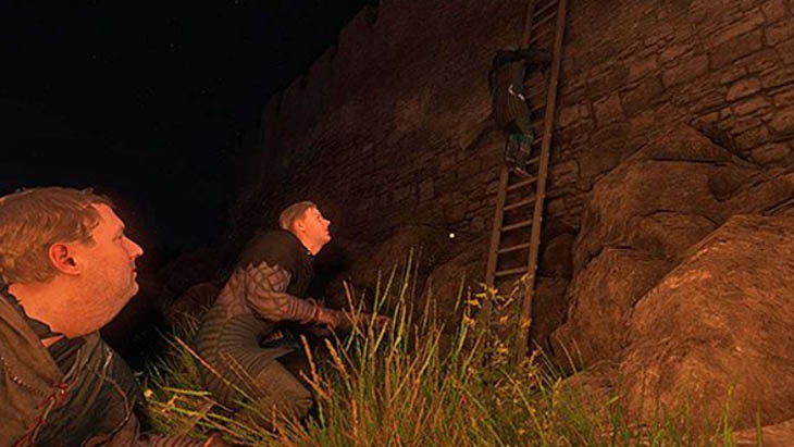 Следуйте за отрядом лазутчиков к стене крепости. После того как они поднимутся по лестнице и устранят часовых, вы получите доступ на территорию. Для ускоренного завершения задания достаточно намеренно обнаружить себя и отступить к лестнице, покинув замок.