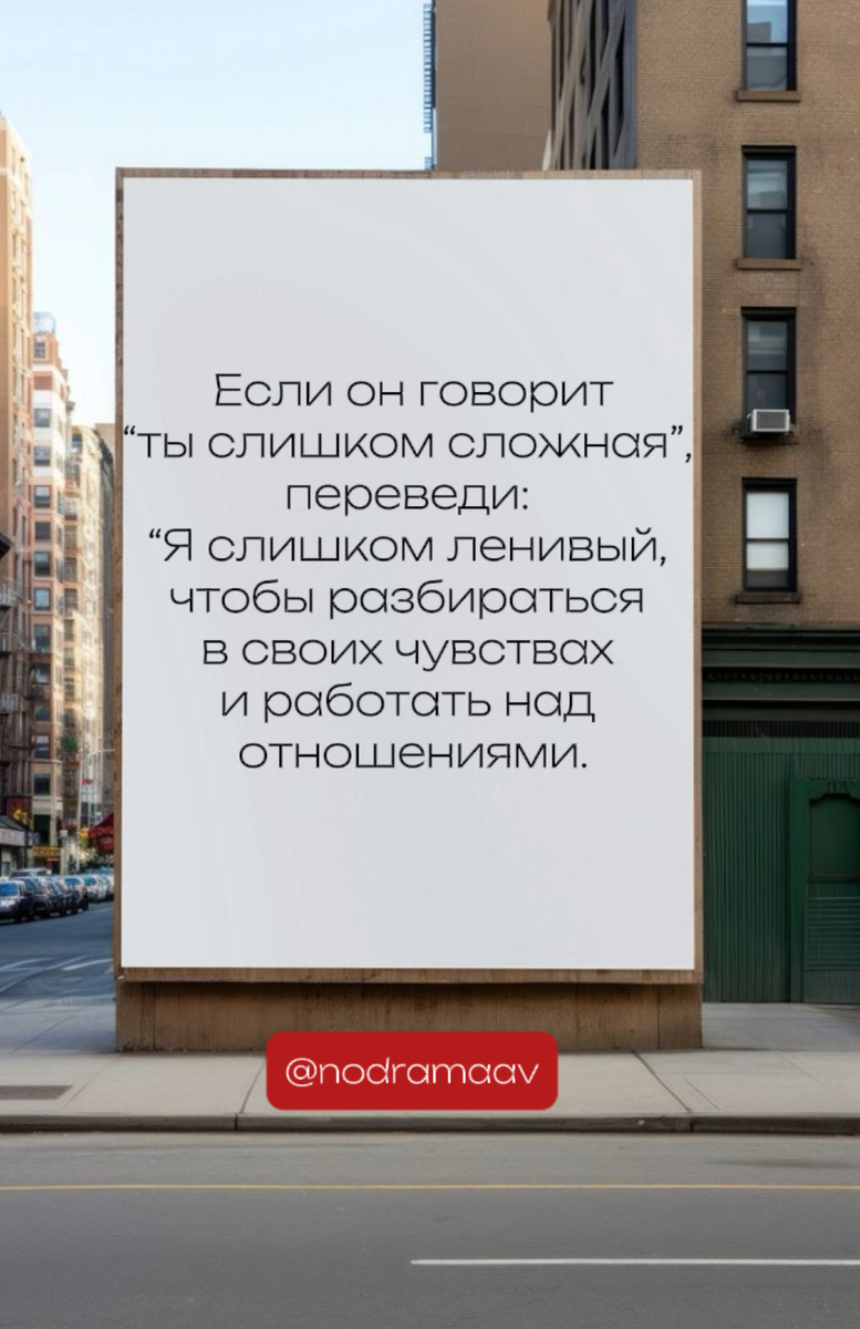 Ты когда-нибудь слышала фразу: «Ты слишком сложная»? Если да, поздравляю: перед тобой человек, который просто не хочет (или не умеет) разбираться в своих чувствах. Разберёмся, что на самом деле стоит за этой фразой, и как не попадаться в ловушку чужой эмоциональной лени. Что мужчина подразумевает под «сложностью»? Когда мужчина говорит «Ты слишком сложная», он может иметь в виду: ❌ «Ты хочешь, чтобы я брал ответственность за свои слова и поступки.» ❌ «Ты задаёшь вопросы, на которые мне не хочется отвечать.» ❌ «Ты не соглашаешься на всё, что мне удобно.» ❌ «Ты показываешь, что отношения — это не только кайф, но и работа.» И да, это правда: ты не простая. Потому что настоящая женщина — это не бесконечное удобство и покорность. Почему мужчинам проще сказать «Ты сложная», чем разобраться? Потому что разбираться в чувствах — это труд. Нужно уметь: ✔️ Слушать, а не закрываться в оборону. ✔️ Признавать ошибки, а не винить партнёра. ✔️ Проявлять эмоции, а не