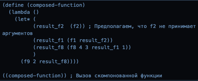 Реализация композиции (если бы это было возможно) на Scheme (или другом функциональном языке): В функциональном языке (например, Scheme или Haskell), где функция compose определена, было бы желательно выразить это как композицию функций. Однако, данное выражение не совсем подходит для прямой композиции в классическом понимании, потому что: • Функции принимают разное количество аргументов. • Аргументы не передаются последовательно через функции, а вкладываются друг в друга. Можно попытаться смоделировать это, создавая промежуточные функции: