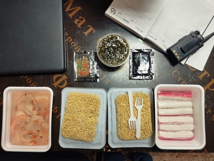 В связи с нестабильной экономической ситуации в моем кошельке, в НИИ Доширакологии публикую свое исследование в рамках концепции "Выжить на сотку". Дано два голодных человека на работе. Задача с минимальными затратами покушать чего-нибудь вкусного и ненадоевшего. Введите описание к изображению (не обязательно) Решил приготовить лапшу с морепродуктами. Из морепродуктов берем креветки в пятёрочке, к сожалению акции сегодня не было, по ней расход можно сократить вдвойне. Лапшу на усмотрение в контейнере. Я взял Доширак с курицей, но сын сказал что с грибами было бы вкуснее, в итоге лапша дошим грибная. Дополнительный топинг - крабовые палочки на развес. На закуску - салат из морской капусты. Собираем блюдо. Отдельно завариваем креветки кипятком на 5 минут и размораживаем крабовые палочки. Затем кладем креветку на лапшу, заливаем, ждем. Когда лапша заварилась, кидаем палки, открываем капусту, наливаем пуэрчик. И дегустируем. Ждем лапшу, размораживаем палки. Как и ожидалось, это намного вку