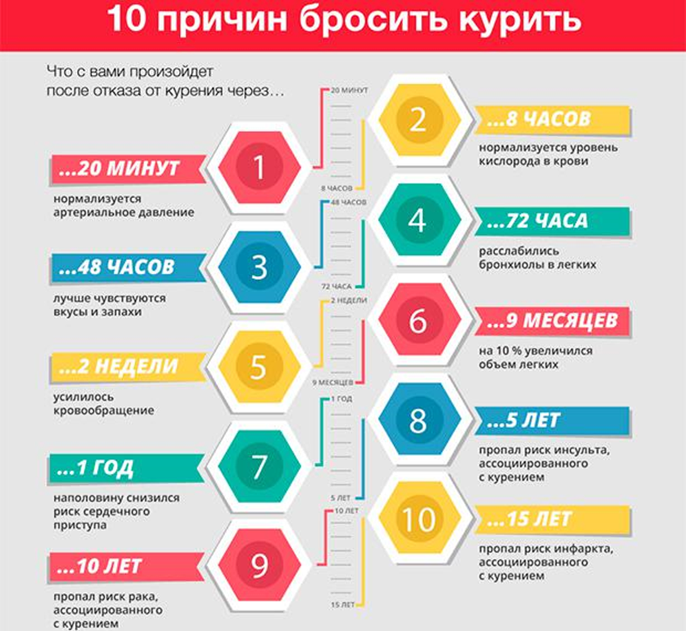 Таким образом, мы подошли вплотную к самому «легкому» и надежному способу бросить курить под называнием «жареный петух». В сложной ситуации бросают курить все. В большинстве случаев это бывает поздно, но иногда нет. Нет – это когда уже случился инсульт или инфаркт, но второй еще не наступил. Чтобы предотвратить второй инфаркт и бросают курить. Лучше, конечно, до этого не доводить. Чтобы легче было бросить курить, Американское Общество по борьбе с раковыми заболеваниями разработало Шкалу выздоровления от курения – по часам, дням и годам: