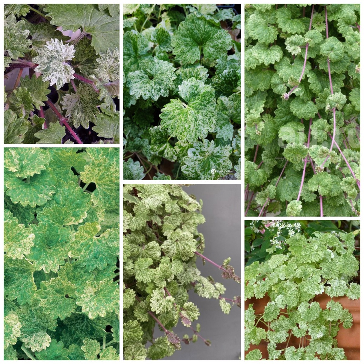 Будра плющевидная «Дэпплет Лайт» (Glechoma hederacea «Dappled Light»), ее еще называют «Мраморная» имеет розовые стебли, на которых расположены сердцевидные с резным краем листья, поверхность которых похожа на мрамор – зелёная гладь с бело-серыми вкраплениями.