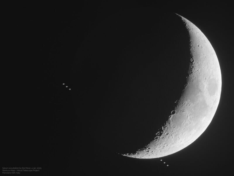 Недавнее космическое событие привлекло внимание астрономов и фотографов — Луна оккультировала Сатурн. Это редкое явление создало захватывающие возможности для наблюдений и фотографирования, особенно с помощью телескопов. 4 января 2025 года, Луна оккультировала Сатурн, что с точки зрения Земли означало, что Сатурн на короткое время перемещался за Луной. Это явление можно было увидеть невооруженным глазом, однако для лучшего восприятия рекомендуется использовать бинокли или телескопы. Астроном и выдающийся фотограф доктор Джанлука Маси зафиксировал это событие в замечательных деталях с помощью удаленно управляемого телескопа в рамках своего проекта Virtual Telescope Project, основанного в Италии в 2006 году. Доктор Маси наблюдал, как Луна накрывает Сатурн, зафиксировав серию изображений, которые впоследствии использовал для создания композитного изображения, опубликованного выше. «Изображение выше является результатом комбинации нескольких экспозиций, удаленно снятых с помощью робота-те
