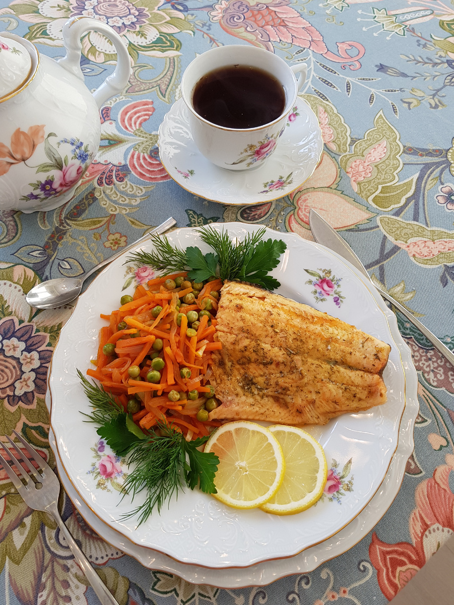 Добрый день, дорогие друзья! Сегодня я предлагаю вам приготовить ароматную форель на ужин и дополнить ее тушеными овощами. Для приготовления нам понадобятся: форель весом 1,2 килограмма, 1 морковка, 1 головка репчатого лука, 300 грамм замороженного зеленого горошка, 200 грамм протертых томатов, 1 лимон, 2 столовые ложки масла из виноградных косточек, 1,5 чайные ложки соли, 1 чайная ложка приправы для рыбы, несколько веточек розмарина, зелень укропа и петрушки. Приготовление: у форели удалить плавники и хвост. Почистить ее от чешуи, удалить голову, разрезать вдоль брюшка и удалить внутренности. Если внутри рыбки оказалась икра, то ее можно посолить по этому рецепту: Отрезать у рыбы часть хвоста, разрезать вдоль позвоночника и удалить кости. Кости, которые находятся перпендикулярно плоскости разреза форели, удалить с помощью кухонного пинцета. Филе на коже посолить, посыпать приправой, полить 1 столовой ложкой растительного масла и убрать в холодильник на 20 минут. Нарезать соломкой лу