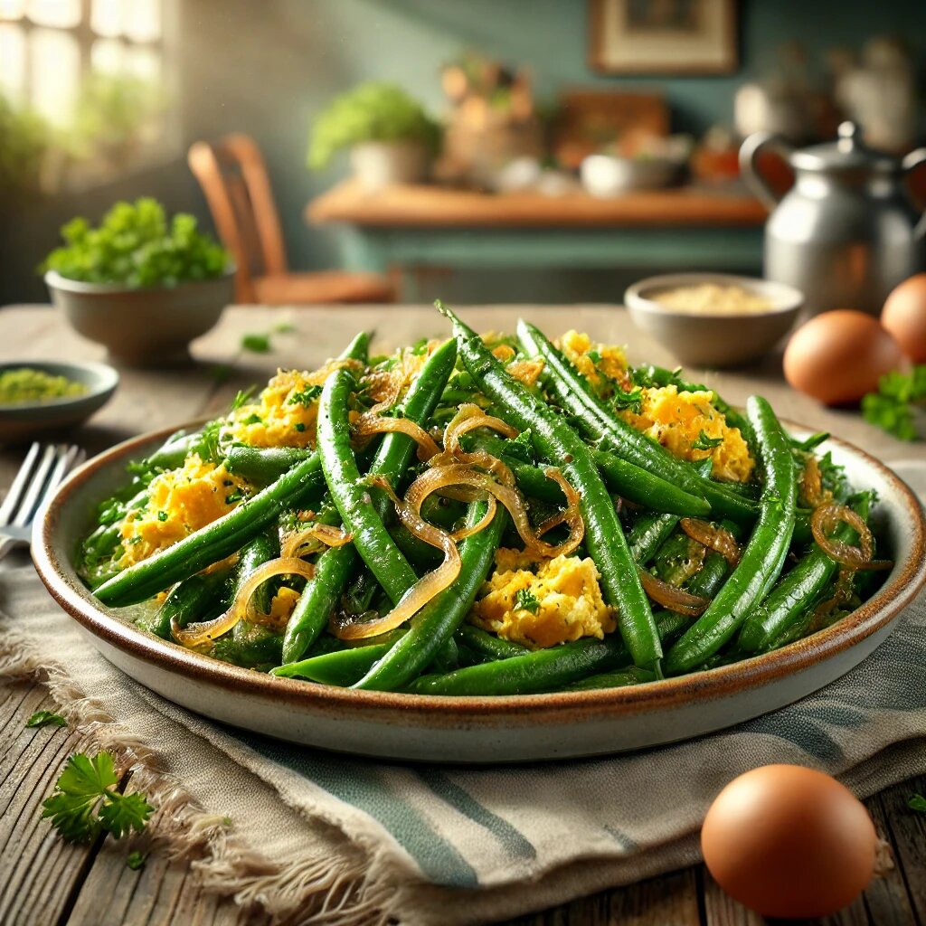 ✔ Соль и перец – по вкусу 🥄 Если используешь замороженную фасоль, залей её кипятком на 2-3 минуты, затем слей воду. 🥄 Если фасоль свежая, промой её и обрежь кончики. 🔥 Разогрей сливочное и растительное масло на сковороде. 🔥 Нарежь лук мелкими кубиками, обжарь до золотистого цвета. 🔥 Добавь измельчённый чеснок, перемешай и жарь ещё 1 минуту. 🥗 Добавь фасоль в сковороду, перемешай и туши 5-7 минут на среднем огне. 🥗 Посоли, поперчи и перемешай. 🥚 Вбей яйца прямо в сковороду, перемешай их с фасолью