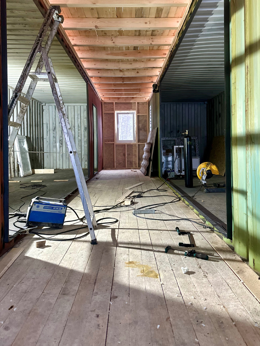 Приветствую всех читателей блога «Евдошино Подворье»! Продолжая рубрику «Строим дом из морских контейнеров», я публикую дальнейшие этапы нашего строительства. Мы приступили к планированию внутренних пространств. Для этого, в первую очередь, нам нужно было выровнять пол в центральной части дома. Из-за особенностей конструкции нашего строения дощатый черновой пол по центру был расположен чуть ниже остального. Мы решили эту проблему при помощи плит ОСБ толщиной 9 мм. Укладка плит сделала пол ровным и более устойчивым, а щели между досками исчезли, создавая ощущение большего комфорта. Следующим этапом стало планирование расположения внутренних стен и перегородок. Изначально мы задумывали дверь в одну из комнат сбоку, но в итоге решили упростить планировку. Теперь по центру дома будет располагаться просторная кухня-гостиная, из которой можно напрямую попасть в любое другое помещение. Такая конфигурация оказалась более функциональной и удобной для повседневной жизни. Чертежник из меня