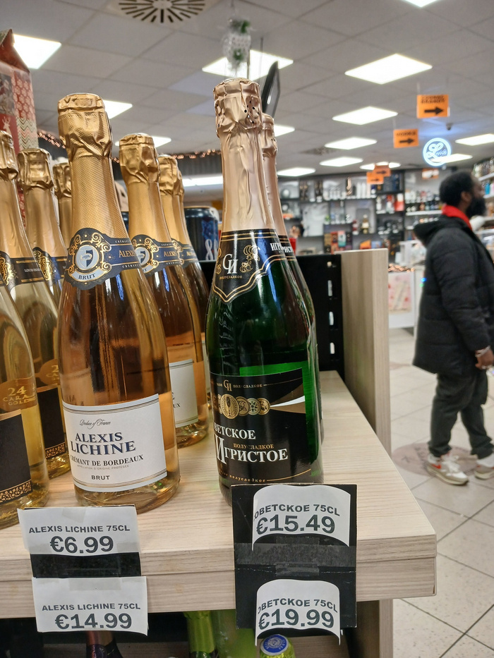 Вещи, которые выглядят экзотикой могут стоить безумно дорого. Вот например "Советское шампанское" в одном из магазинов в Голландии. Справедливости ради, надо сказать, что в польском магазине тут оно стоит 4 евро. Точно такое же. Но, любопытство же никто не отменял. Это я вырос в Латвии, где и латиница и кириллица были для меня нормой, а тут русские буквы выглядят такой же схемой для вязания крючком, как для нас тайское письмо. Под новый год тут люди, как и везде, нет нет да подвыпившие и им хочется каких-нибудь приключений на одно место и тут, надо отдать должное бренду "Советское шампанское", приключения гарантированы. Естественно, этот напиток не имеет ничего общего с тем советским шампанским - просто в восточной Европе купили эти "буквы" по лицензии и продают их ностальгирующим по тем тёмным временам. Поляки, несмотря на ненависть к совку, таки покупают на новый год такую бутылку, как прикол. Как правило, в 12: 00 они её взбалтывают и выстреливают пробкой под грохот салюта и всё сод