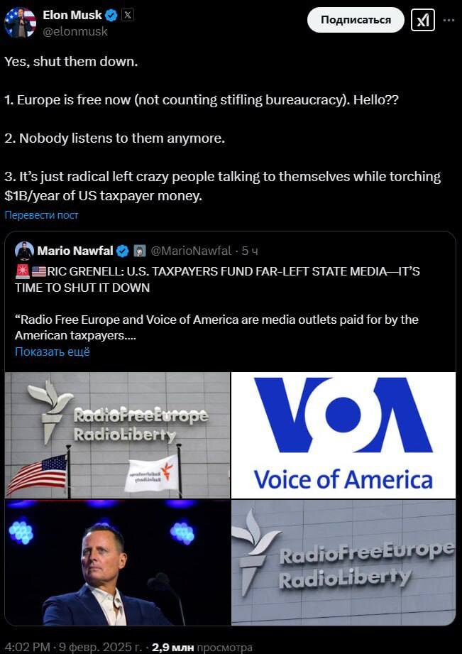⚡️Маск призвал закрыть издания «Радио Свобода» и «Голос Америки».