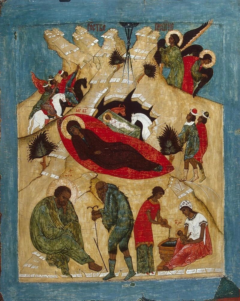 Кроме того, порядок слов в этом четырëхсловном именовании выбран такой, что антонимы-эпитеты "младо" и "превечный" поставлены рядом, подчëркивая парадоксальность события, когда вневременный Бог поселяется во времени, Тот, который "Ветхий денми", одновременно и новорождённый младенец. Этот контраст закрепляется и звуком: греческое " младо" (нéон) созвучно тому, что было переведено словом "превечный" (в сочетании "о про эóнон" последнее слово - это "века" в родительном падеже). Не случайно и то, что существительные "отроча" и "Бог" расположены по краям, на полюсах этой словесной группы. Точно так же "Дева" и "Бог" обрамляют всë стихотворение. Здесь мне видится и смысловая перекличка с первой строкой, где "Дева днесь пресущественного рождает". То есть, и там, и там разными словами утверждается одно: "днесь пресущественного рождает" - "родися отроча младо превечный Бог". Это всë об одном, но по-разному. Зачем понадобился этот смысловой повтор?