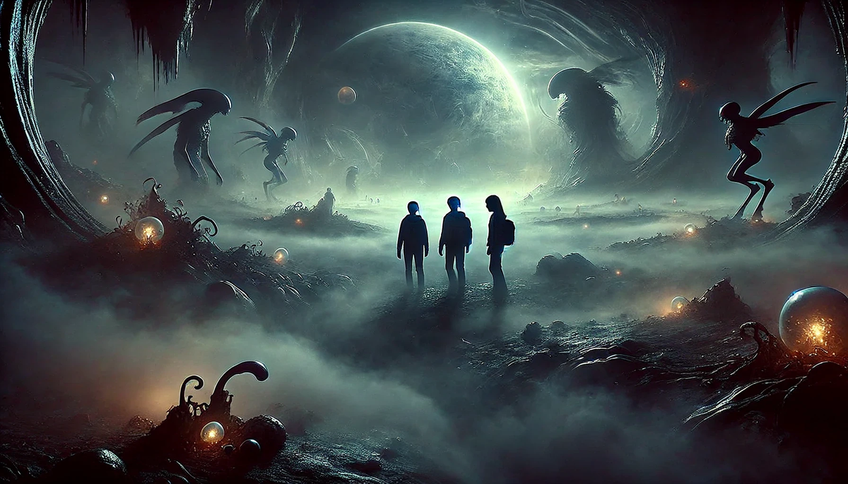Герои продолжали свой путь через необъятные просторы космоса. Этот раз их путешествие привело их на планету, покрытую вечной тьмой, где солнце никогда не светило, а единственным источником света были таинственные светящиеся объекты в воздухе. Густой туман окутывал поверхность планеты, а странные формы существ перемещались по темным просторам. Планета была не такая, как те, что они видели раньше. Тишина здесь была необычайно плотной, и каждое их слово казалось растворяющимся в темном воздухе. Этот мир, как будто поглощал все живое и неживое в своей тени. Существа, которые жили здесь, называли себя Хранителями тьмы. Эти загадочные существа с темными телами и светящимися глазами утверждали, что тьма — это не зло. Они верили, что именно тьма даёт смысл свету, и что без тьмы свет был бы пустым и бессмысленным. Для Хранителей тьма была источником равновесия, она необходима, чтобы создать гармонию во вселенной. — Без тьмы не было бы света — говорил один из Хранителей, стоя перед Рами, Лили и