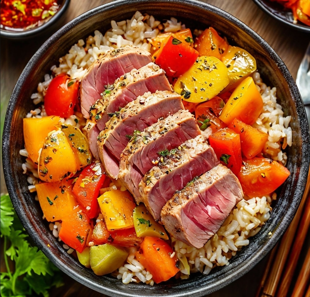 Ингредиенты: - Тунец (филе) - 2 шт. - Рис - 1 стакан - Морковь - 1 шт. - Лук репчатый - 1 шт. - Перец болгарский - 1/2 шт. (по желанию) - Масло растительное - 3 ст. ложки - Соль - по вкусу - Специи - по вкусу (например, смесь перцев) Приготовление: 1. Рис промыть и отварить до готовности в подсоленной воде. 2. Нарезать морковь и перец кубиками или полукольцами. Лук нарезать мелко. 3. Разогреть сковороду с растительным маслом и обжарить лук до золотистого цвета. Добавить морковь и перец. Обжаривать овощи на среднем огне 5-7 минут, периодически помешивая. 4. Нарезать филе тунца на кусочки и добавить в сковороду к овощам. Обжарить рыбу с овощами на среднем огне, часто помешивая, до готовности рыбы (около 7-10 минут). 5. Добавить специи по вкусу, соль. Перемешать и жарить еще 1-2 минуты. 6. Готовый рис выложить на тарелку, сверху выложить рыбу с овощами и посыпать зеленью. Приятного аппетита!