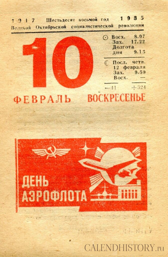 Итак, сегодня 10-го февраля и у нас на календаре 1985-й год. Перед нами листок советского календаря для женщин. На календаре у нас воскресенье - 10 февраля 1985-го года. ДЕНЬ АЭРОФЛОТА *** Оборотную сторону листка этого календаря можно посмотреть у нас по ссылке на сайте. Другие листки советских календарей смотрите у нас на сайте - CALENDHISTORY.ru ПОСМОТРИТЕ ЕЩЁ ЛИСТКИ ОТРЫВНЫХ КАЛЕНДАРЕЙ: