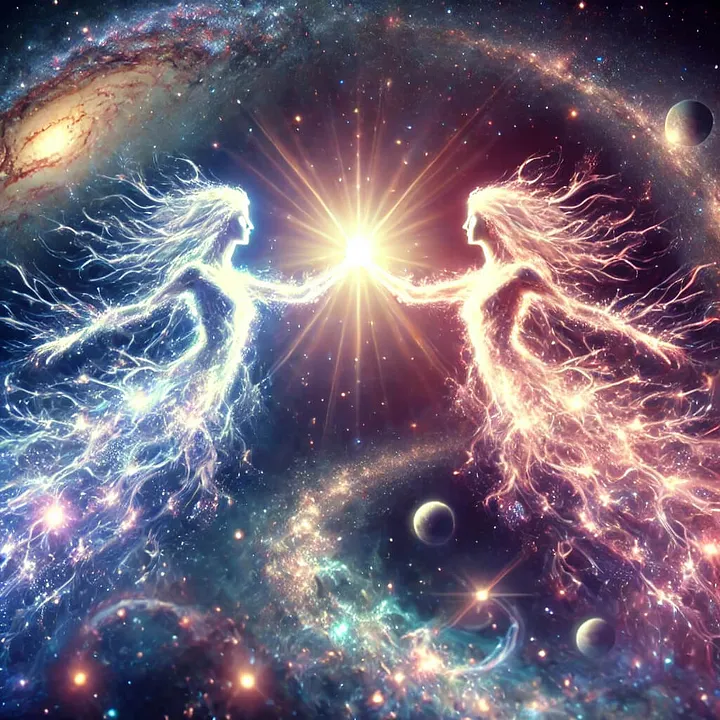 В космических просторах, где тишина пространства служит полотном для балета звёзд и галактик, лишь немногие слышат сокровенный шёпот: сагу о Близнецовых Пламенах. Эти души зарождаются из одной небесной искры, являясь двумя половинами единой сущности и скитающимися по Вселенной в поисках воссоединения.